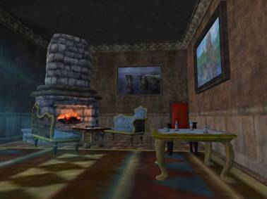 Off my front door is the front room. Here, the fantastical and the mundane are juxtaposed. In the magical world of Norrath (the name of the planet in Everquest 2), houses still have rugs on the floor and paintings on the walls. In fact, a player would actively have to avoid certain in-game activities to keep from obtaining these sorts of items. Accordingly, rugs, paintings, and other household items become mundane not only because they resemble real world mundane objects, but because virtually every other player in the game world has identical items. In addition, the acquisition and placement of these items in the home constitutes another strategy of play. In order to advance in the game, there are tasks or quests that require the player either to rent a home or to acquire items that would be used to decorate one. In this way, the developers encourage the player to see housing and mundane items such as chairs and rugs as parts of play. The mundane everyday becomes the everyday as play, and integrated into the developer's visions of the everyday of play.