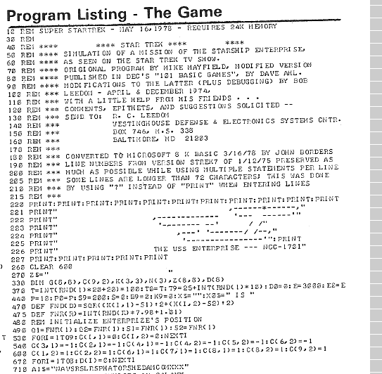 [5] A better sense of this can be had by taking a look at all the various iterations of the game - encompassing versions for a variety of flavors of BASIC and other languages as well - collected by Pete Turnbull (http://www.dunnington.u-net.com/public/startrek/).